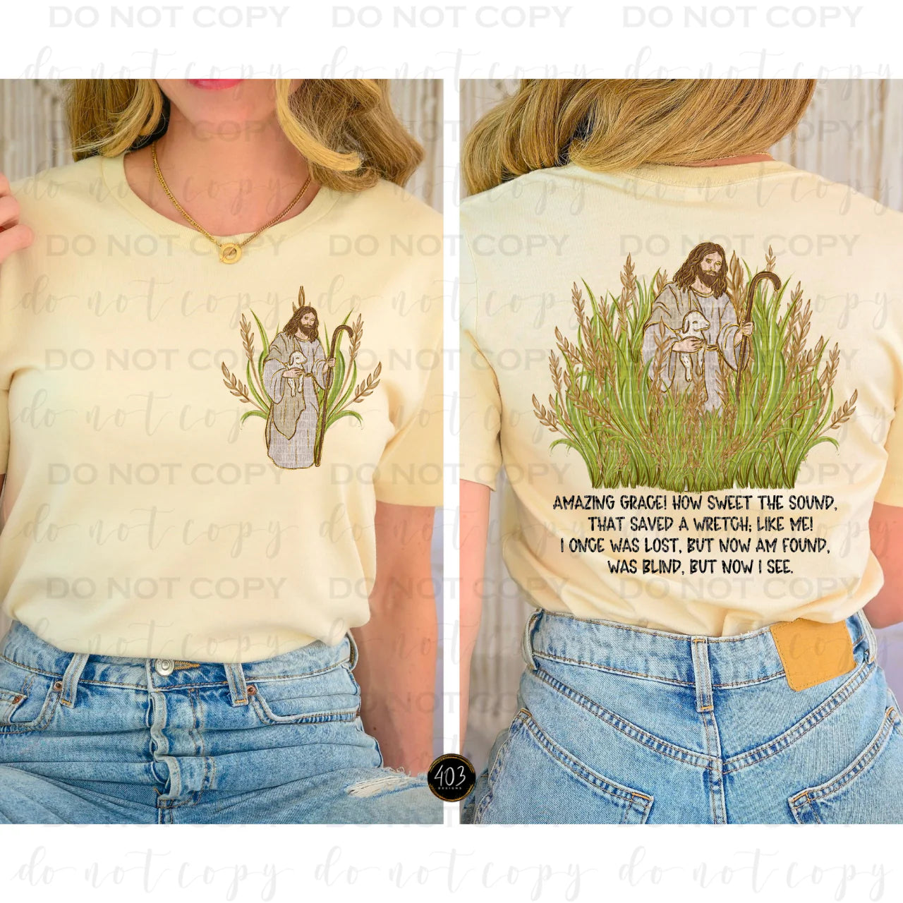 • Back: full “Amazing Grace, How Sweet the Sound” scripture-style artwork with detailed greenery