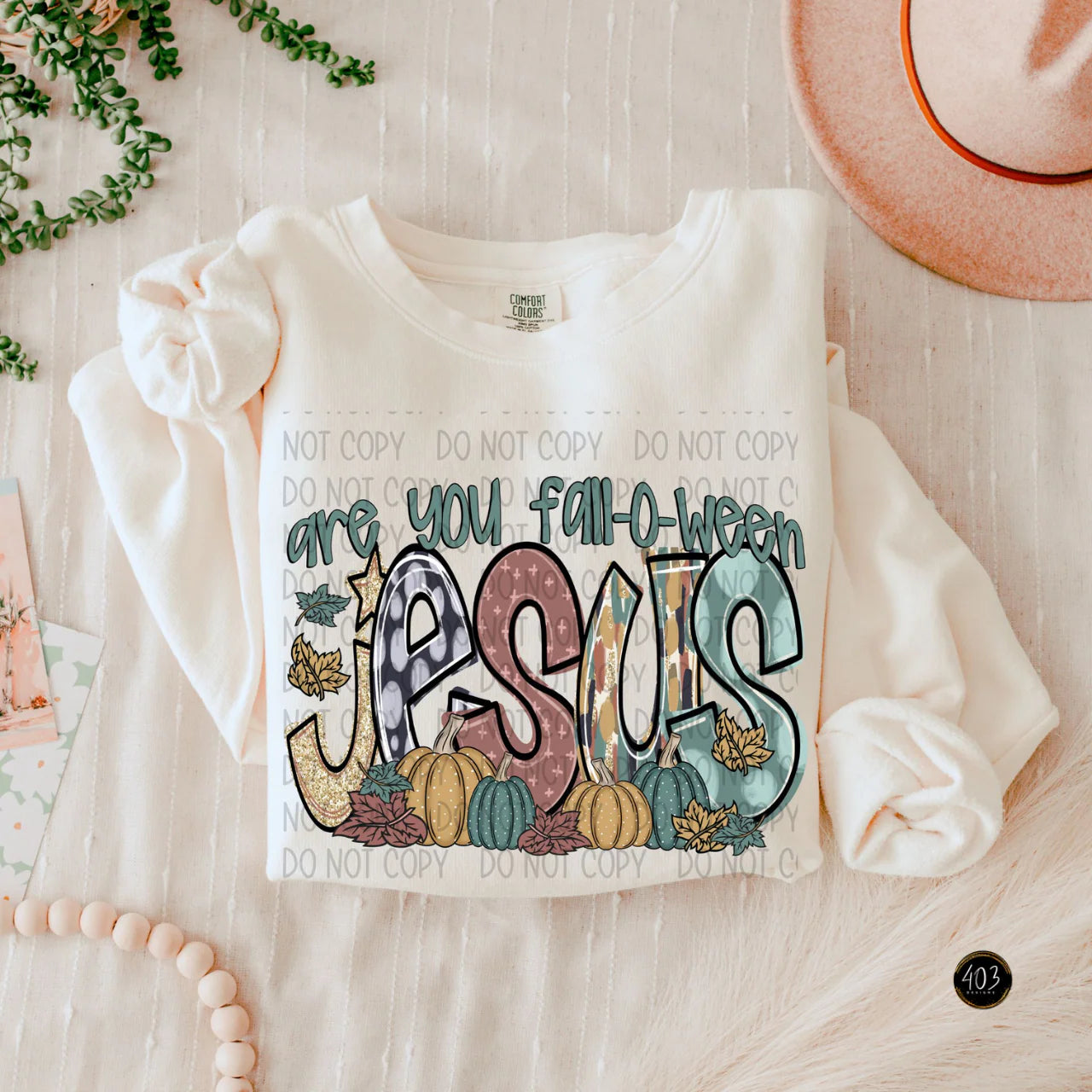 A fun fall-themed Christian design featuring pumpkins, leaves, and the playful phrase “Are You Fall-O-Ween Jesus.” Cozy autumn aesthetic with cute illustrated details.