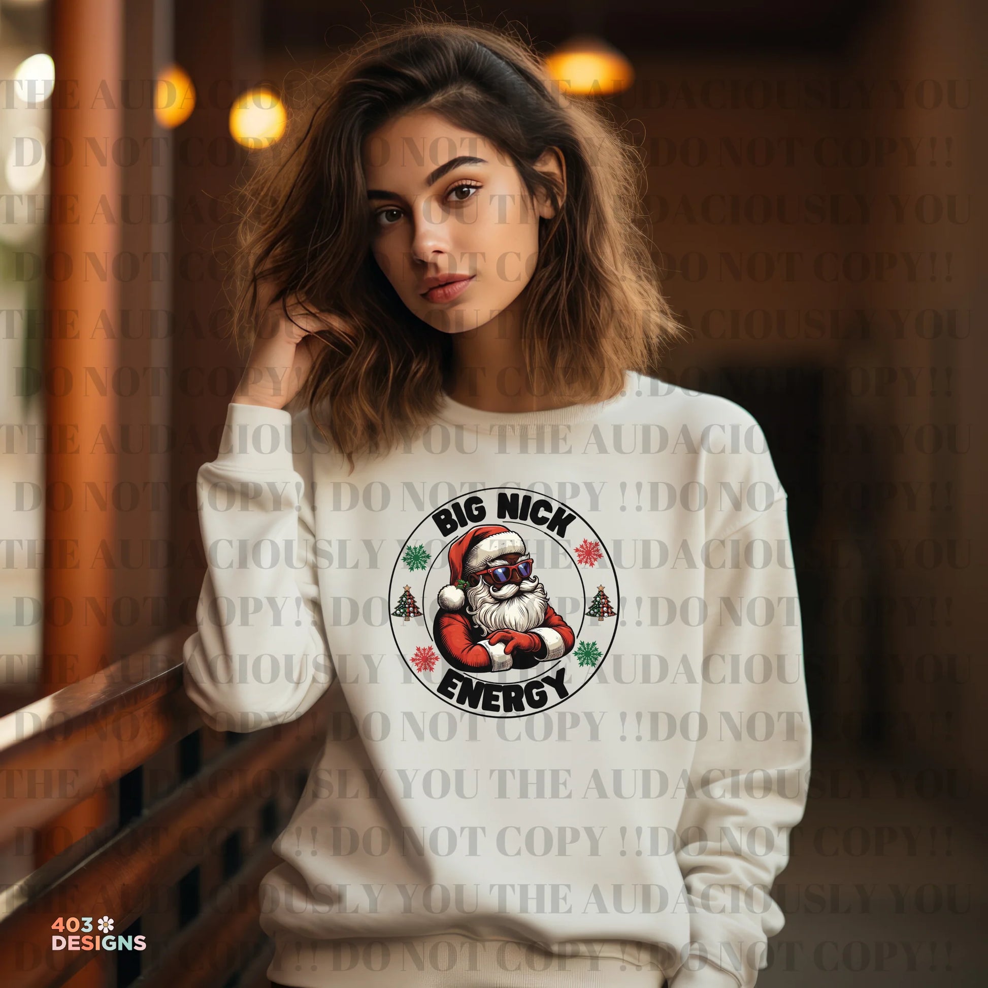 A fun holiday design featuring Santa with major attitude. Big Nick Energy is perfect for Christmas tees, cozy sweatshirts, and festive holiday drops.