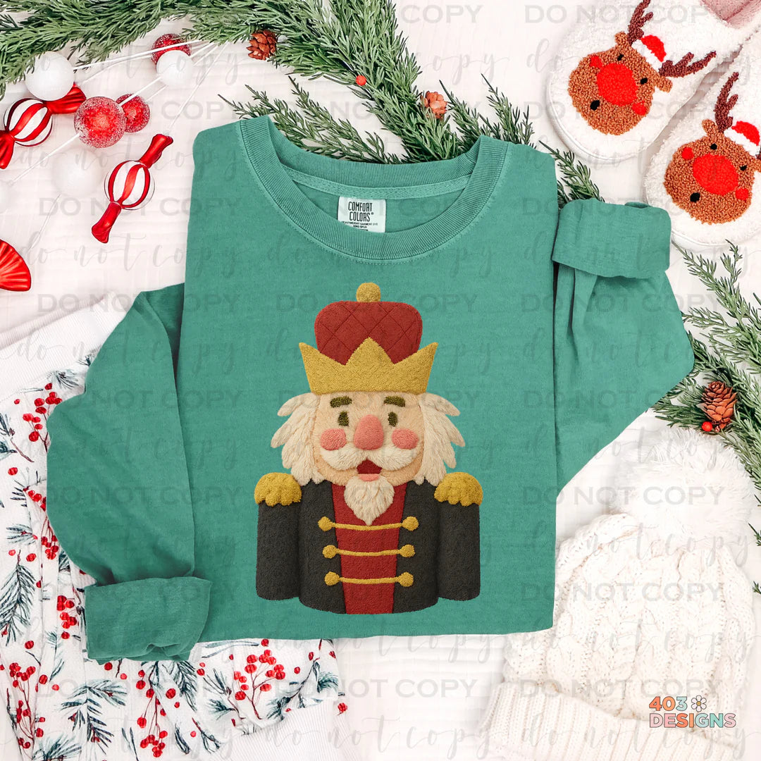 A festive holiday favorite featuring a classic nutcracker design with a cozy faux yarn texture. Perfect for Christmas sweatshirts, holiday pajamas, or seasonal boutique collections.